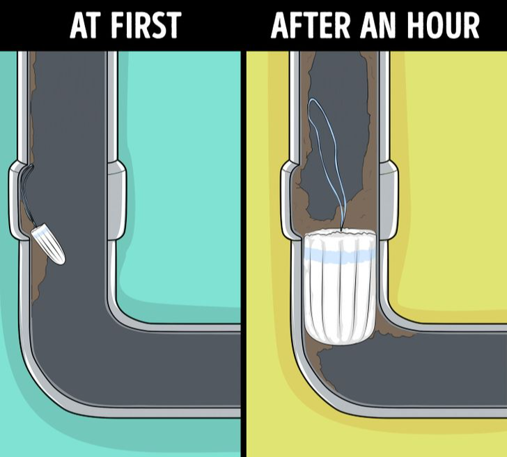 Tampons and pads are engineered for absorption, so they enlarge underwater and wedge in plumbing.