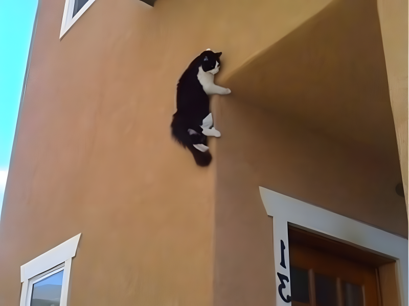 This cat looks like it just swung out of a Spider-Man scene, showing off insane agility and superhero-level confidence as it conquers new heights.
