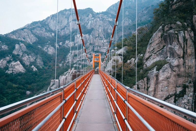 In Wolchulsan National Park, South Korea’s Cloud Bridge lives up to its name—often shrouded in mist 120 meters above a deep valley. This 52-meter suspension bridge is both a hiking highlight and an engineering marvel.