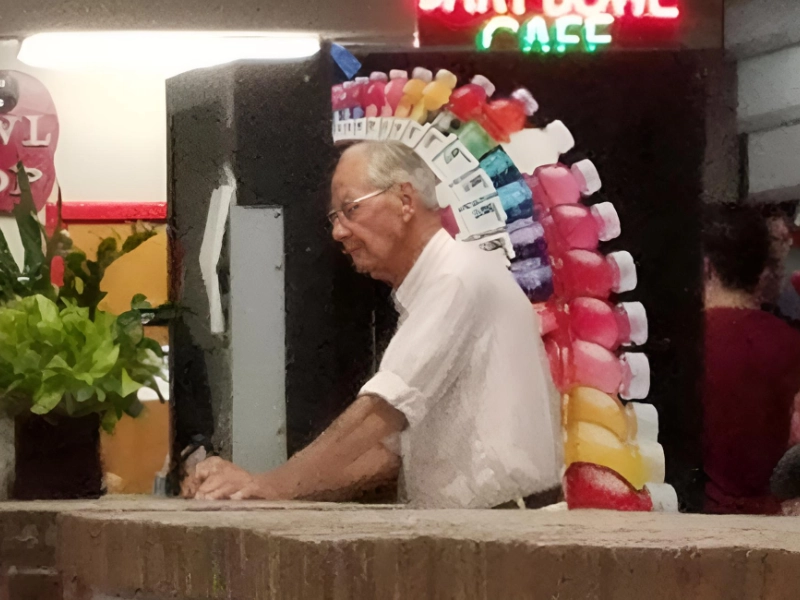 Freezers in convenience stores serve as both storage and unique marketing spaces. They offer a fun backdrop for candid photos that combine humor and product placement. One memorable picture shows an older man playfully posing as a tribal chief, his “headdress” made of drink bottles.