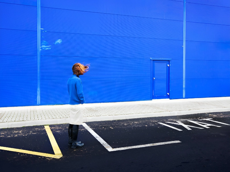 Only the hair awaits blue dye, yet the near match already fools the eye. The figure almost dissolves into the vivid field, proving how a single dominant color can craft a playful vanish between person and backdrop.