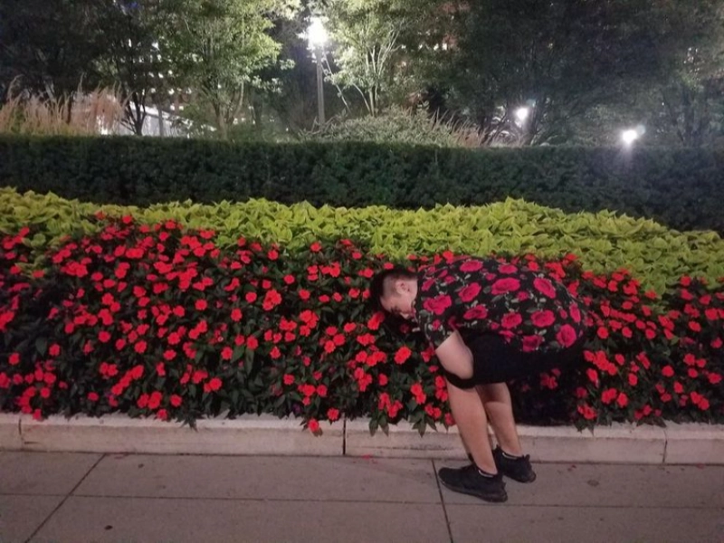 Missing floral pants to complete the trick. One unmatched element adds a light comic note and proves imperfection can charm.