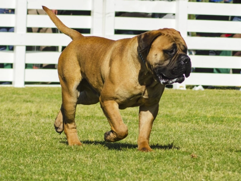 A bulldog and mastiff cross, the Bullmastiff can reach 27 inches and about 100 pounds. Used in the 1800s to deter poachers, it forms tight bonds yet may become a risk without broad social exposure and consistent training.