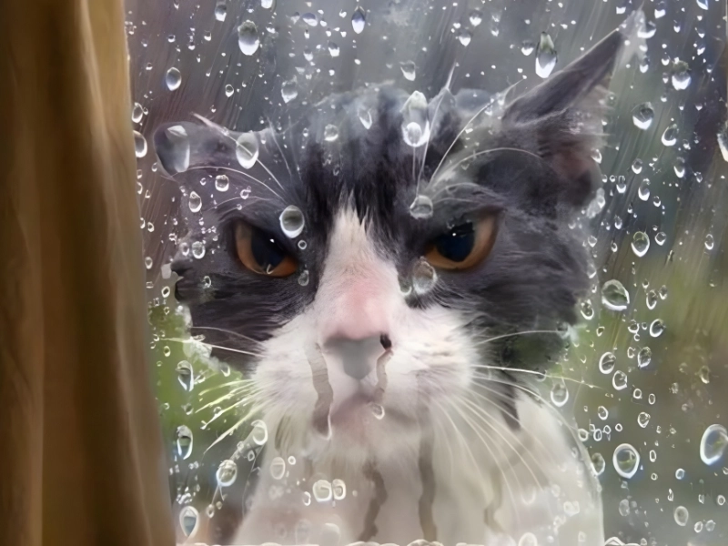 This drenched feline looks thoroughly displeased and likely planning a stern indoor review with the humans.