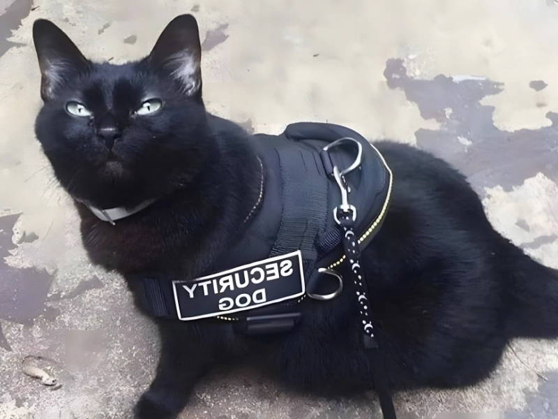 Despite the title this black cat landed the role of security dog. With that steely gaze no nonsense will pass especially from canines.