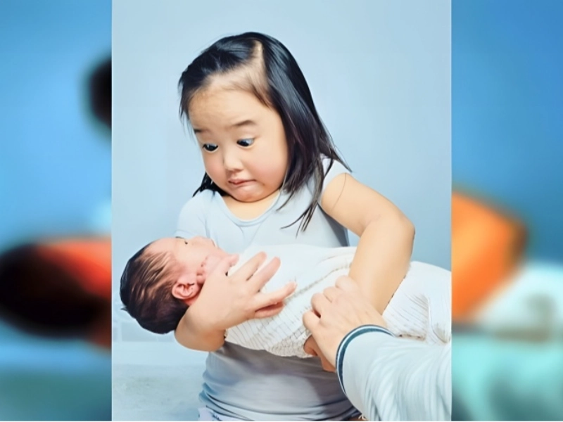 Une petite fille tenant délicatement son frère nouveau-né représente une pure tendresse familiale. Ce moment profondément touchant capture magnifiquement l'essence de l'amour fraternel authentique et de l'innocence naturelle de l'enfance. La fierté évidente et la joie rayonnante de la grande sœur transparaissent clairement alors qu'elle berce tendrement son petit frère, créant une scène réconfortante que les parents chériront précieusement pour toujours. Le lien émotionnel démontré ici ne représente que le début d'une amitié durable qui les accompagnera toute leur vie, et cette photographie préserve un souvenir précieux qui apportera des sourires attendris pendant de nombreuses années à venir.