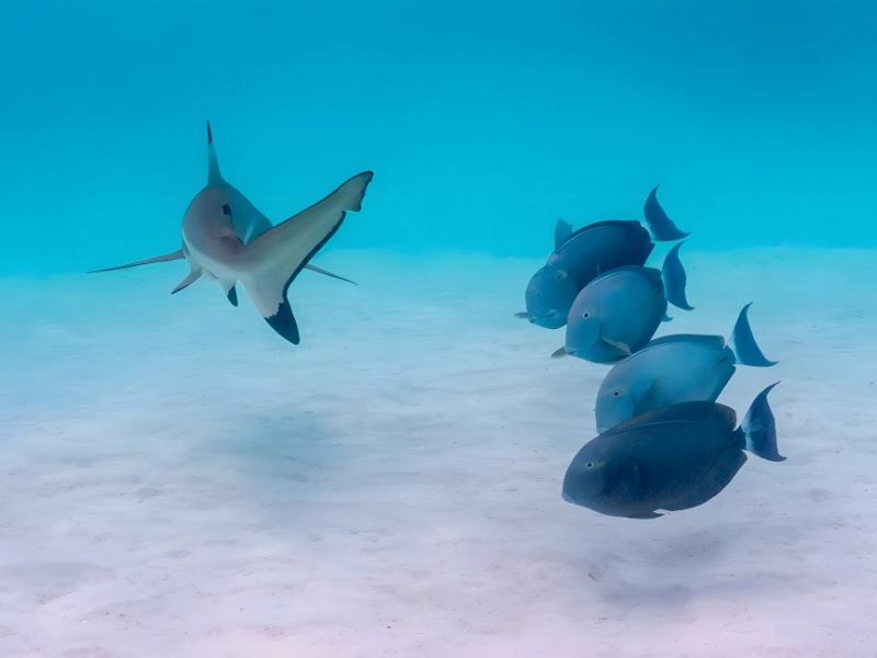 This striking shot shows four surgeonfish trailing a black tip reef shark in Moorea, French Polynesia. Sharks command respect, and the surgeonfish remain poised. The image explores authority and balance, earning a 2023 Comedy Wildlife nod.