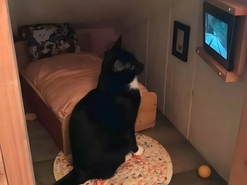 This pampered cat enjoys a private nook beneath the stairs, like Harry Potter’s space yet far more refined. The spot includes a round rug, a toy ball, a small framed picture, and a snug bed with a matching cat patterned cushion. Centerpiece feature A television.