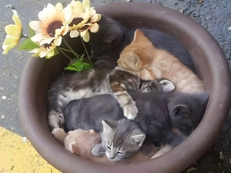Every cat caregiver knows the instant when a feline appears mid yawn in an unlikely place. This playful photo displays a pot packed with curled cats, capturing that delightful surprise.