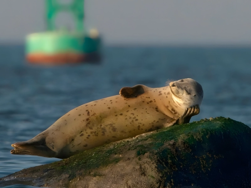 Many of us have curled up after a long week just like this seal, basking in simple comfort. Some New York seals enjoy similar leisure, appearing almost sovereign in their calm.