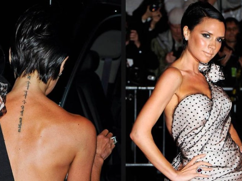 Victoria Beckham bears a Hebrew phrase I am my beloved's and my beloved is mine expressing devotion and commitment especially to family and spouse.