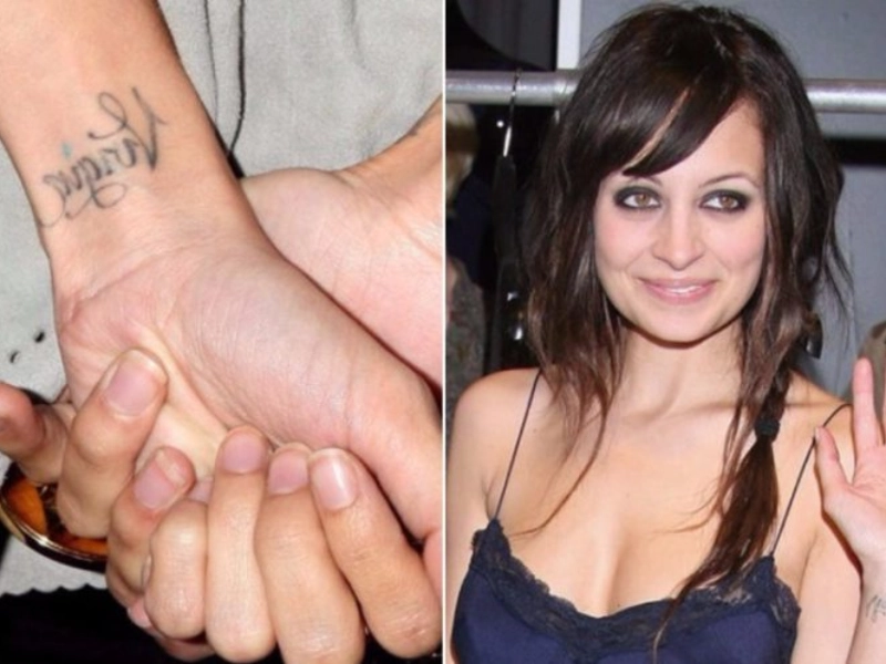 Nicole Richie’s wrist shows the zodiac word Virgin instead of Virgo adding playful twist and personal spin to an astrological sign.