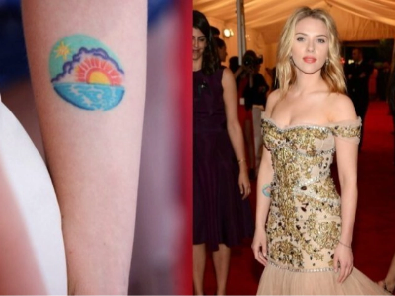 Scarlett Johansson shows tattoos on wrists ankles ribs and forearms. A radiant dawn scene on her left hand symbolizes hope and renewal fueling a creative tone.