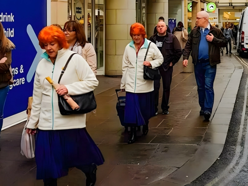 These two women appear to be strangers walking separately, yet they share identical orange hair, wear matching boots, and are dressed in exactly the same outfit.
