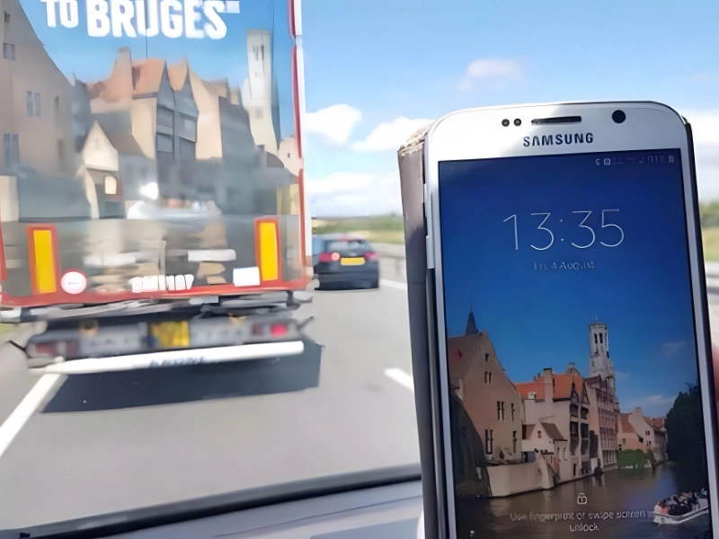 A truck displayed a picture of Bruges on its rear, while the car behind had the exact same image as its phone wallpaper. Bruges is clearly a beloved travel destination.